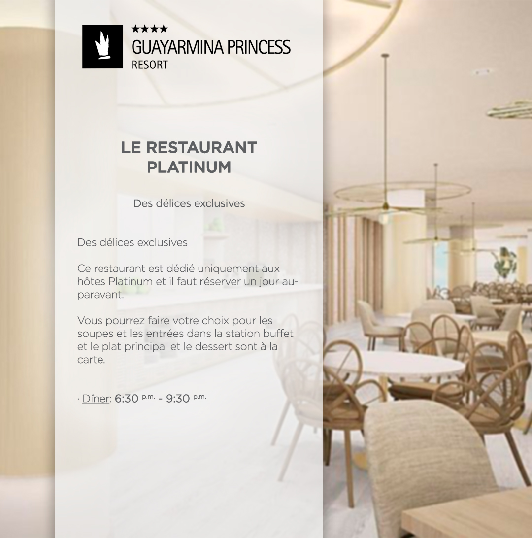 ** REMARQUE: Consultez le menu et effectuez votre réservation pour notre restaurant spécialisé "The Roast" ou notre restaurant Platinum Club avec un minimum d’ 1 jour à l'avance (sous réserve de disponibilité) via l'application web sur votre téléphone portable / tablette à travers l'un des 3 totems: un situé dans la réception principale, le second situé dans le salon Platinum et le troisième situé entre le restaurant Roast et le restaurant Food Market.